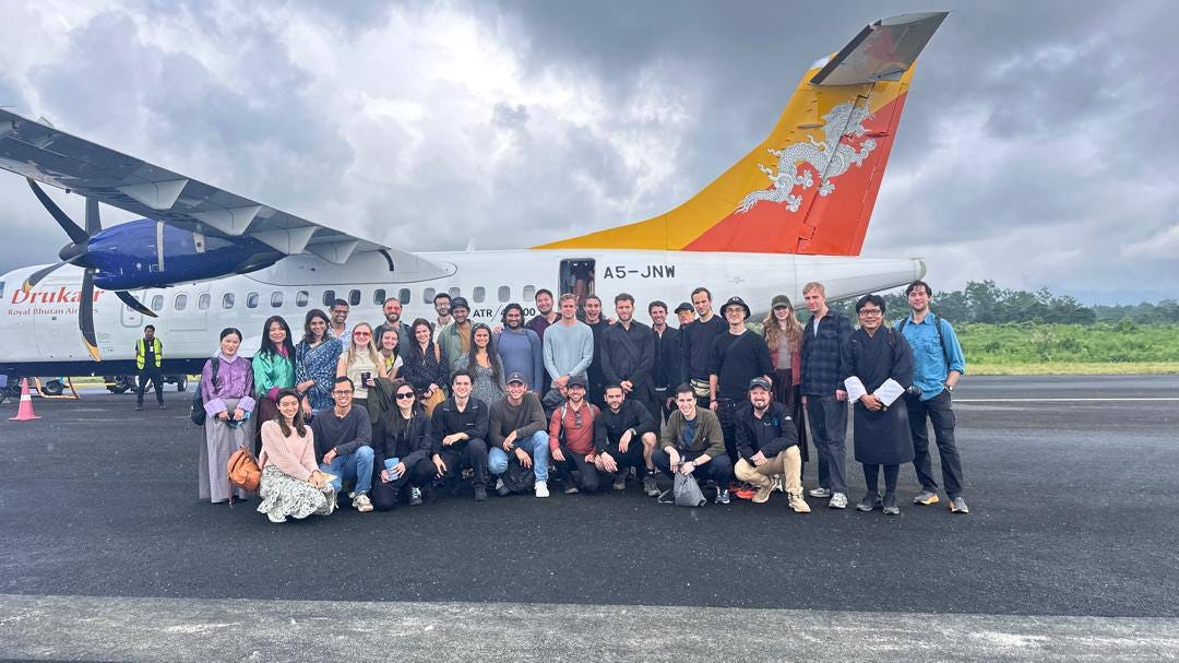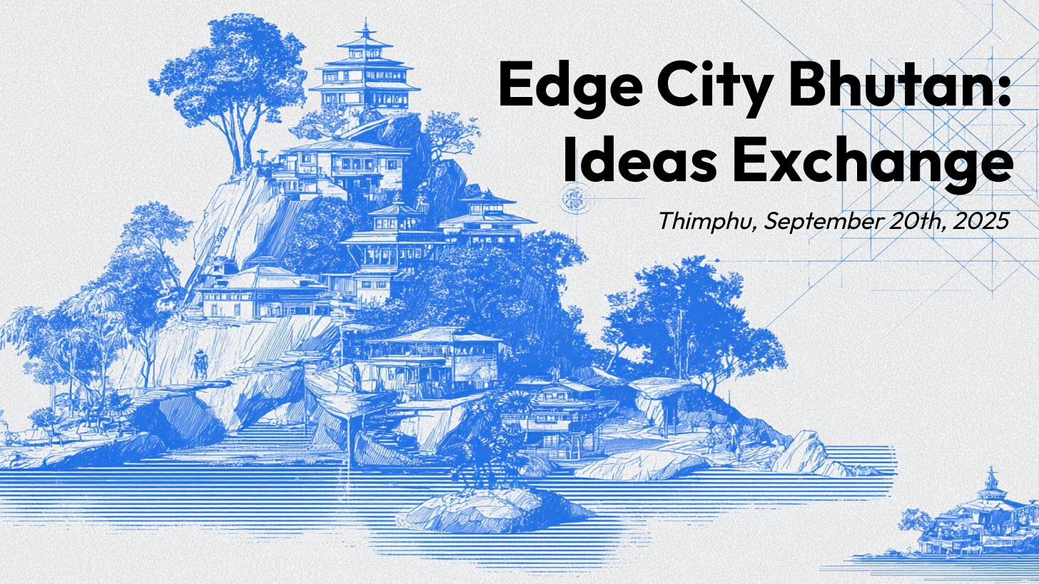 This was my third trip to the country, and this time I brought 30 members of the Edge City community: founders, researchers, artists, and investors, from organizations like Ethereum, SpaceX, IDEO, Paypal, Optimism, and top VCs. We came to explore a national experiment in reimagining development: The Gelephu Mindfulness City (GMC), a project set into motion by the King, which aims to build a new city that combines frontier technology and growth with a bedrock of Buddhist principles.