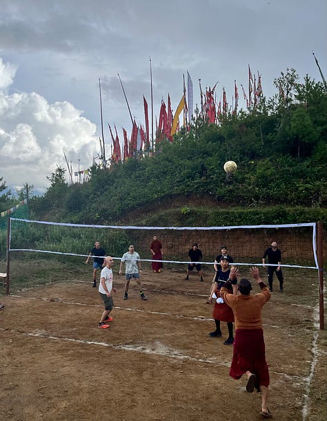 Later in the week, we stayed overnight at Dodedra Monastery, which sits a 2-hour hike above Thimphu, the capital of Bhutan. Near the end of our walk up the mountain, we met a group of monks setting up a volleyball net. They played with us until the rain started falling too hard to ignore, and we ran to a covering to share butter tea and biscuits.