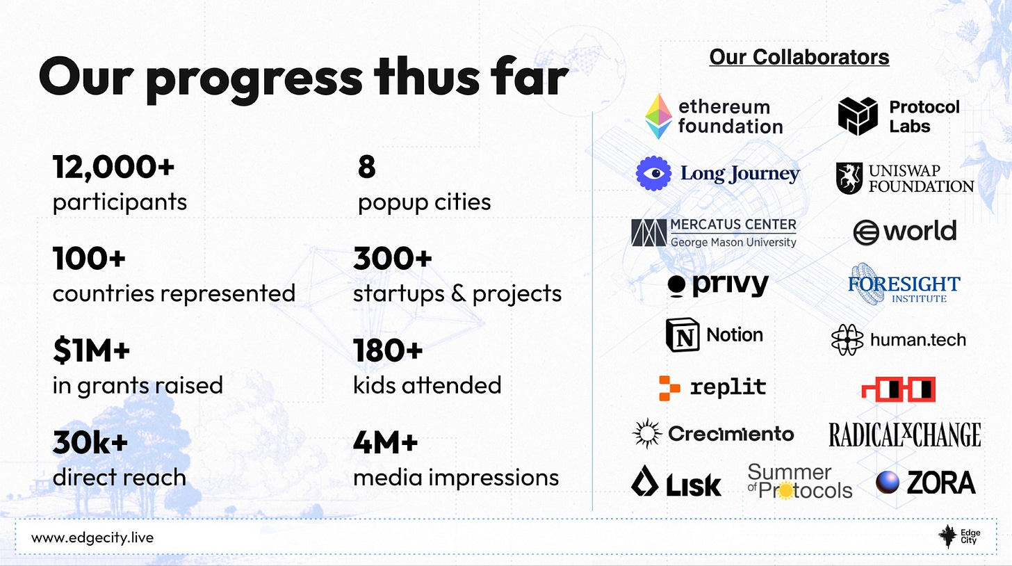 Beyond California, our global roadmap is taking shape. We are currently scouting for Edge City India in Q4, and we are actively planning to return to Bhutan to deepen the collaborations we started this year.