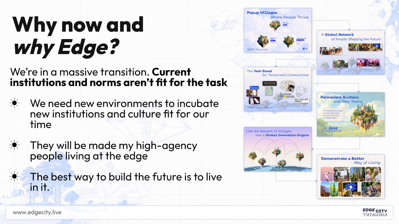 The early days of Edge were about proving we could create something new: month-long popup villages where scientists, technologists, artists, and builders live and work side by side. Environments designed for health and serendipity, where new ideas for society can take root. Multi-generational communities where kids run around while their parents prototype the future.